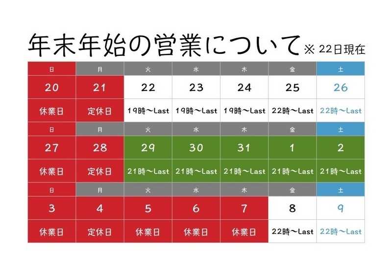 そろそろ年末年始の営業についてお伝えします(^-^)